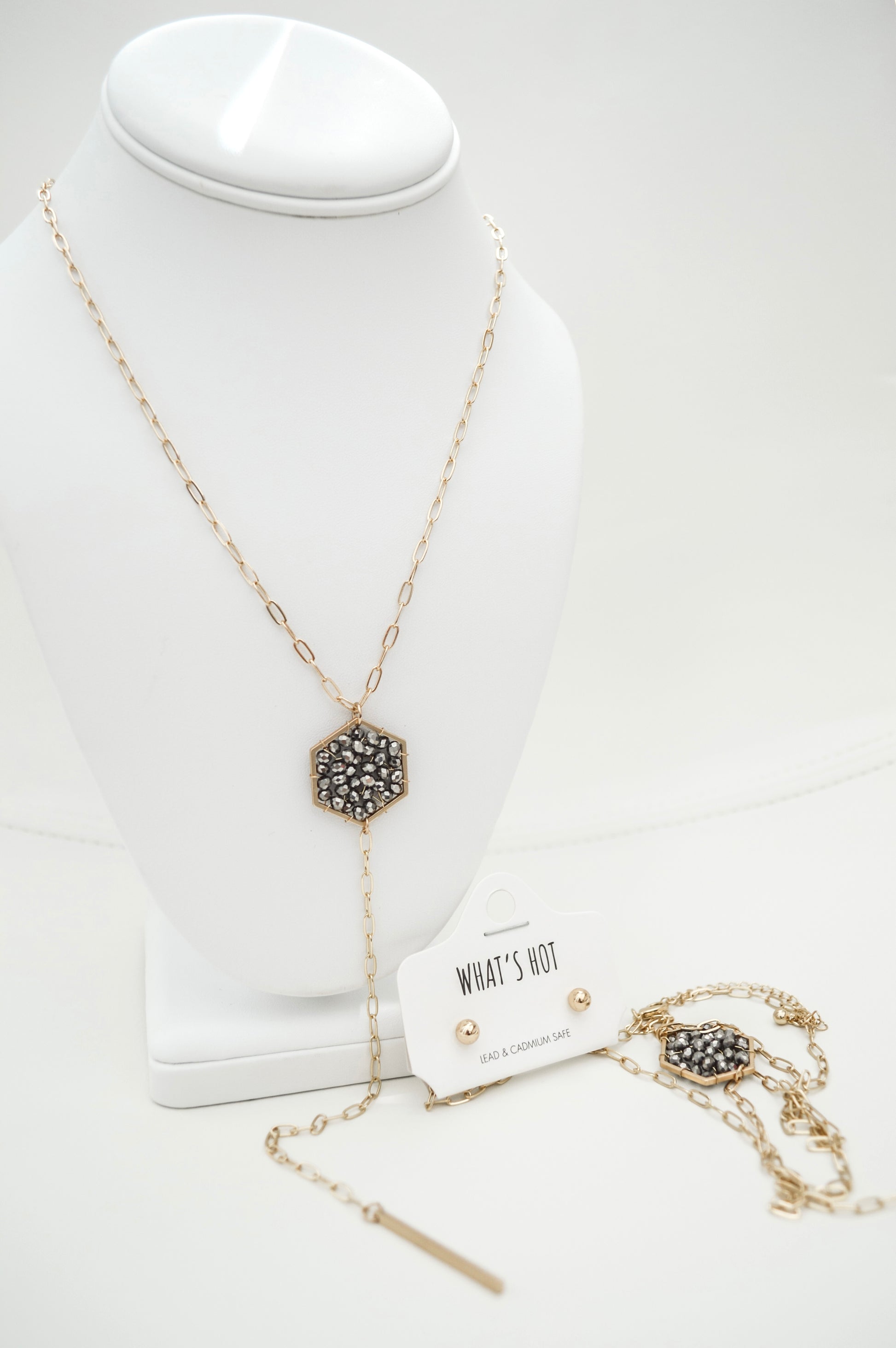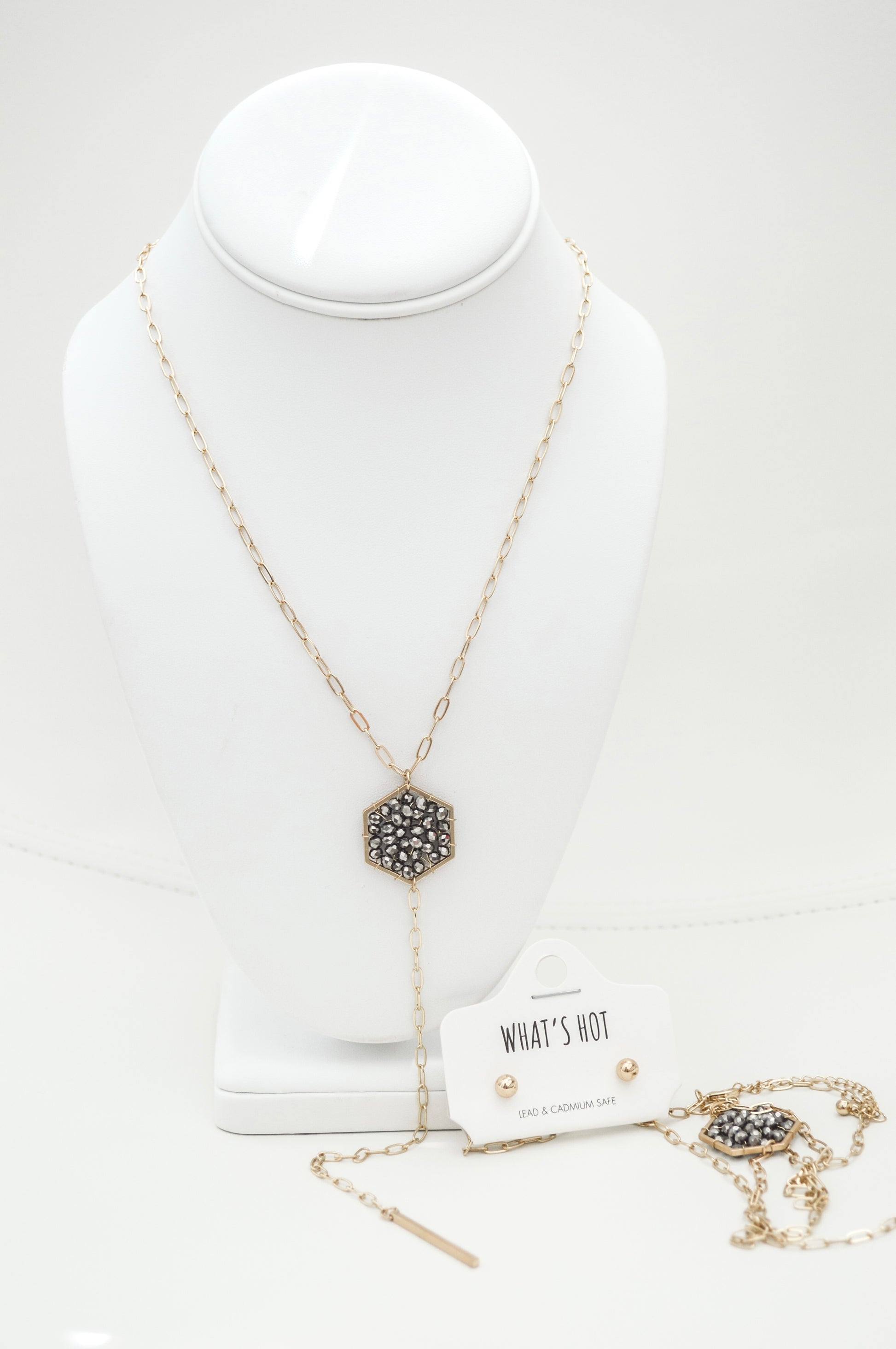 Long, gold chain necklace with a gray sparkly medallion featured in the center! Sold together with gold studs. Necklace is about 30” in length.