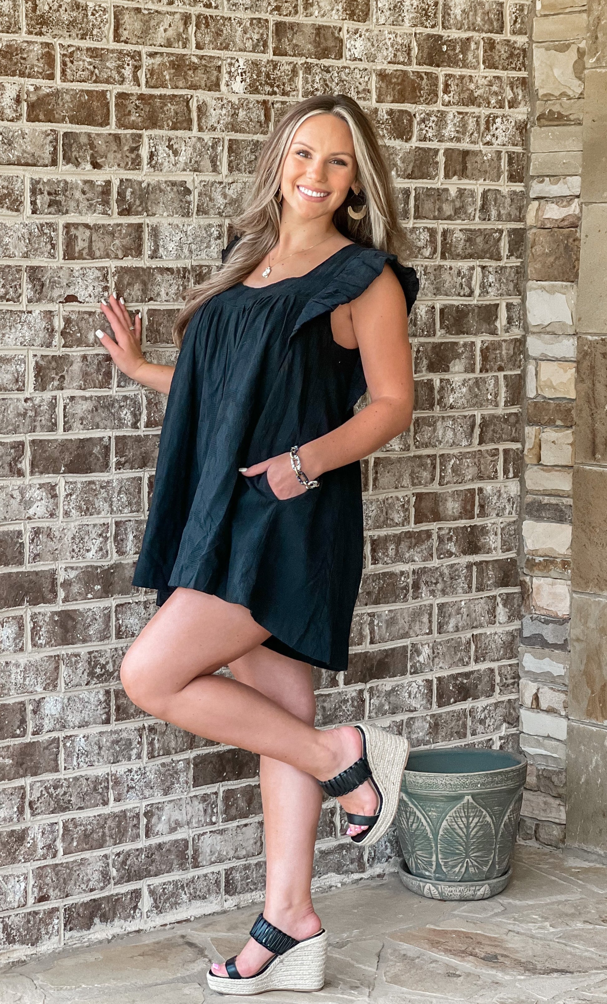 - Adorable midnight black romper with ruffle shoulders and a tie detail in the back!